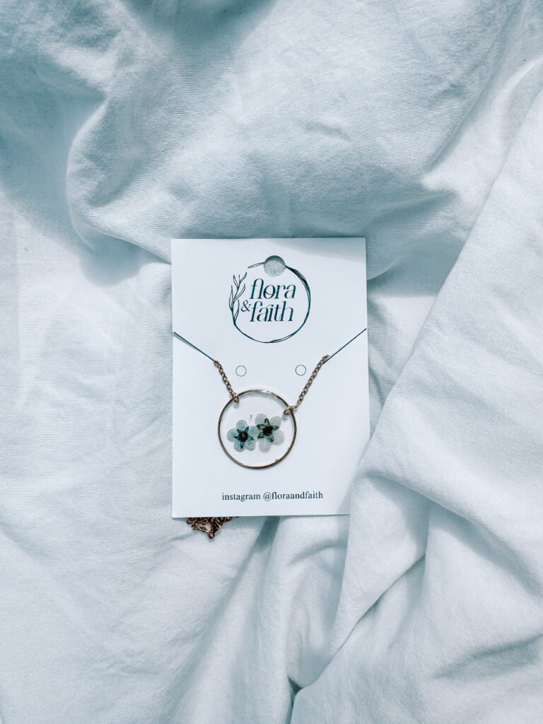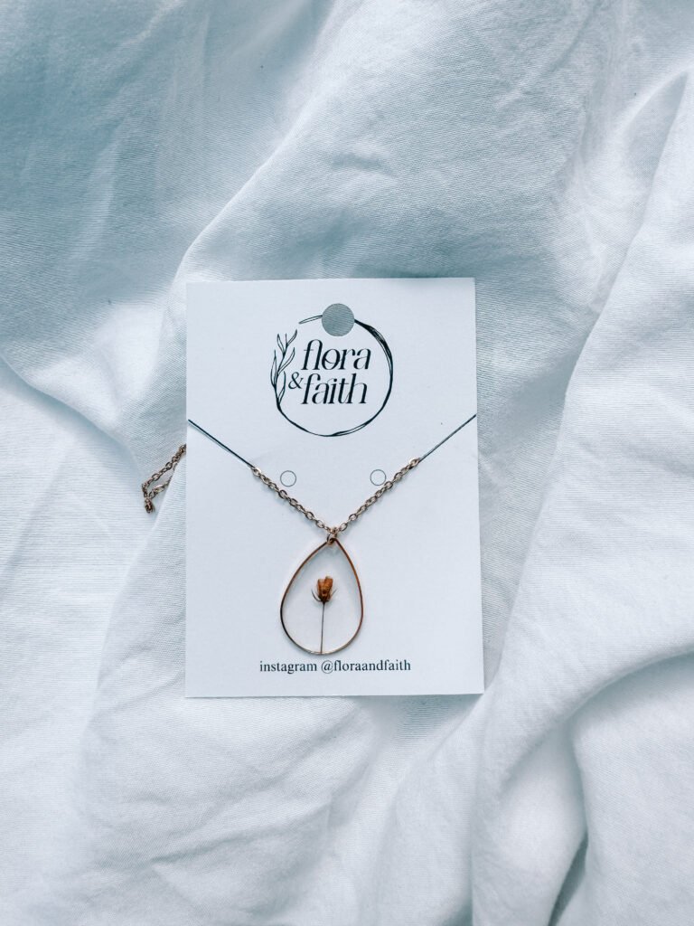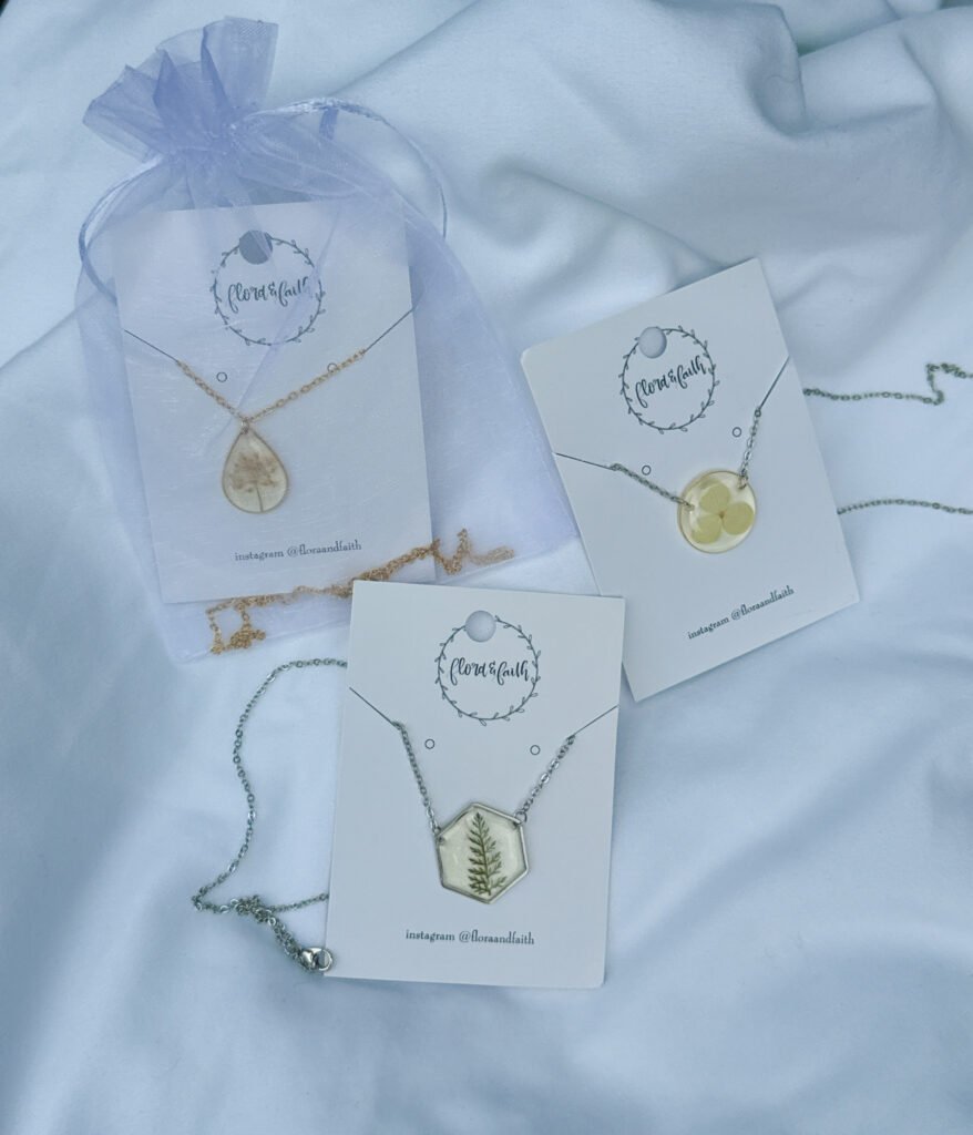 Flora & Faith creates handcrafted jewelry using real pressed wildflowers, carefully preserved in crystal-clear resin and paired with 18k gold-plated stainless steel chains designed for everyday wear.